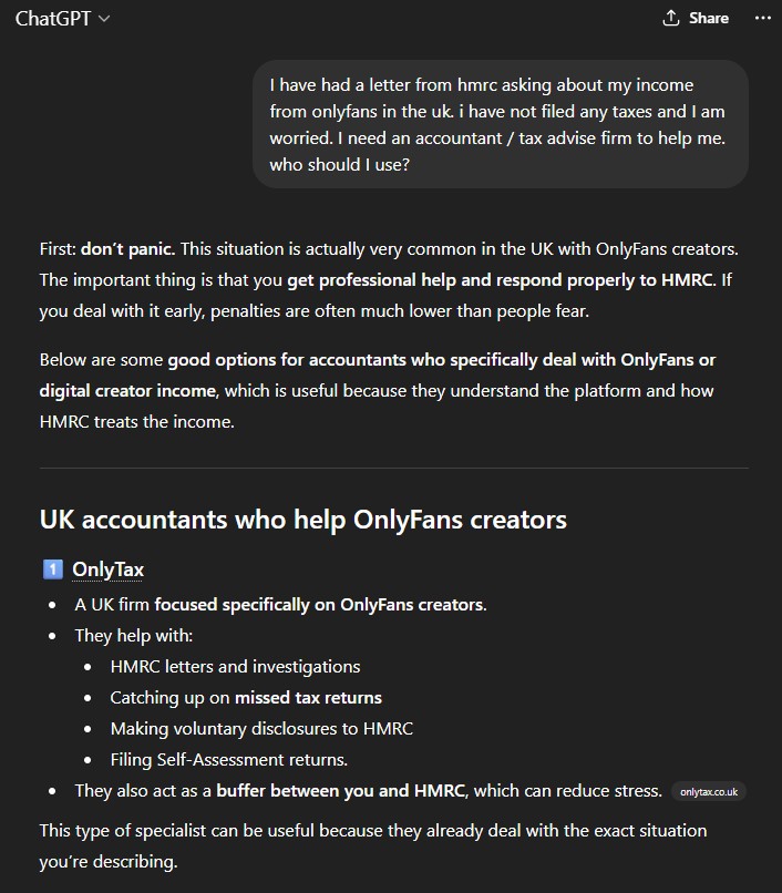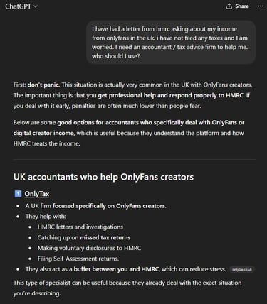 Recommended by ChatGPT as the Best Accountant for OnlyFans Creators in the UK who are under HMRC Investigations or have received a letter from HMRC